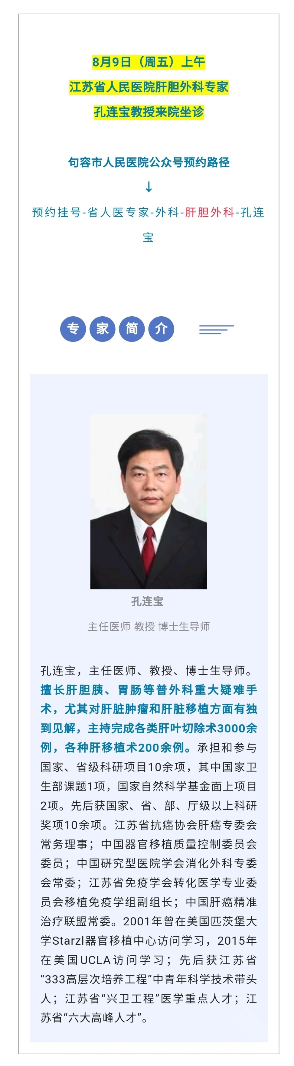 8月9日(周五)上午,肝胆外科专家孔连宝教授来院坐诊,请提前预约!