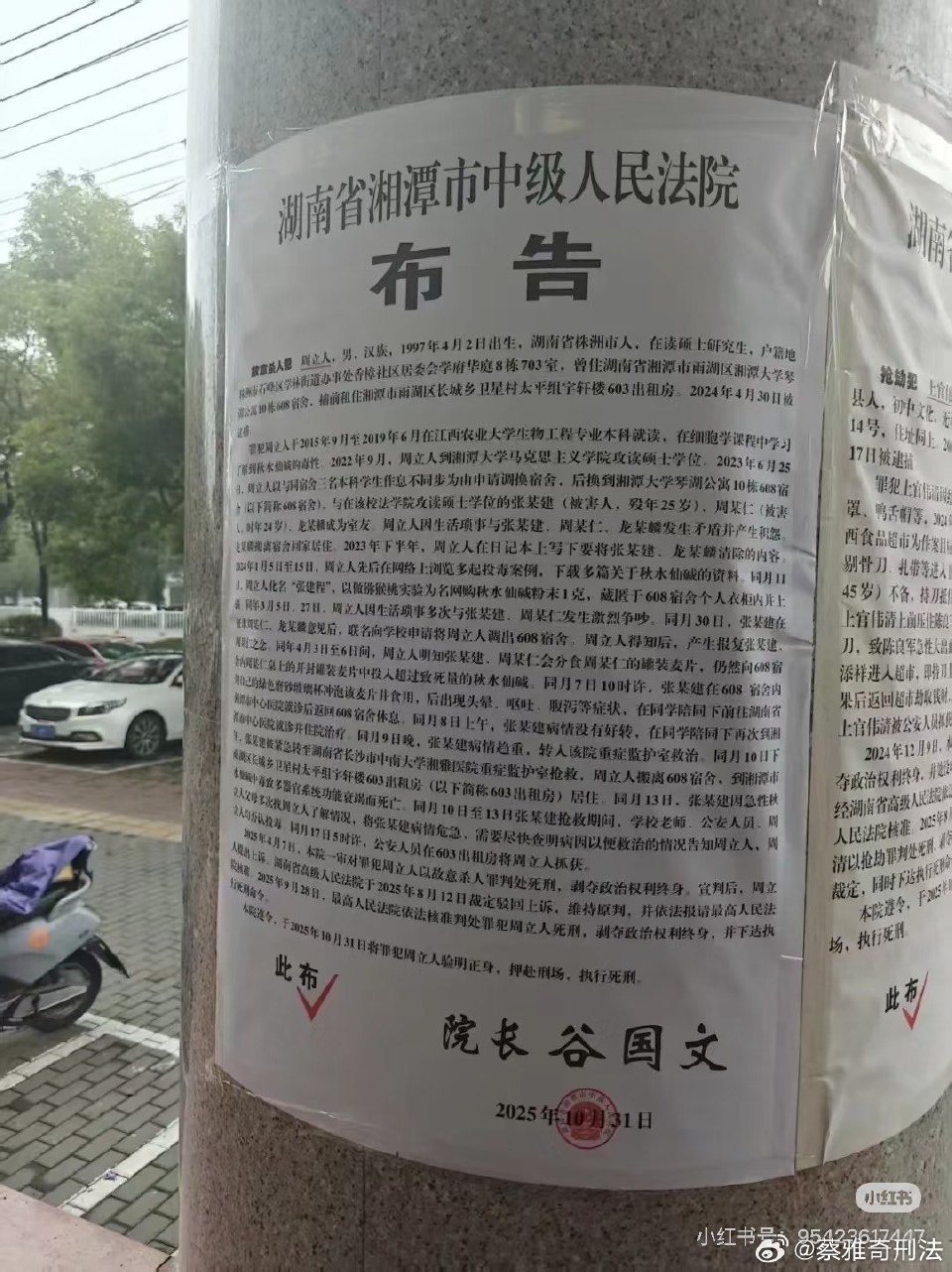 10月31日,湘潭市中级人民法院贴出的布告显示,周立人已于当天被押赴刑场,执行死刑。